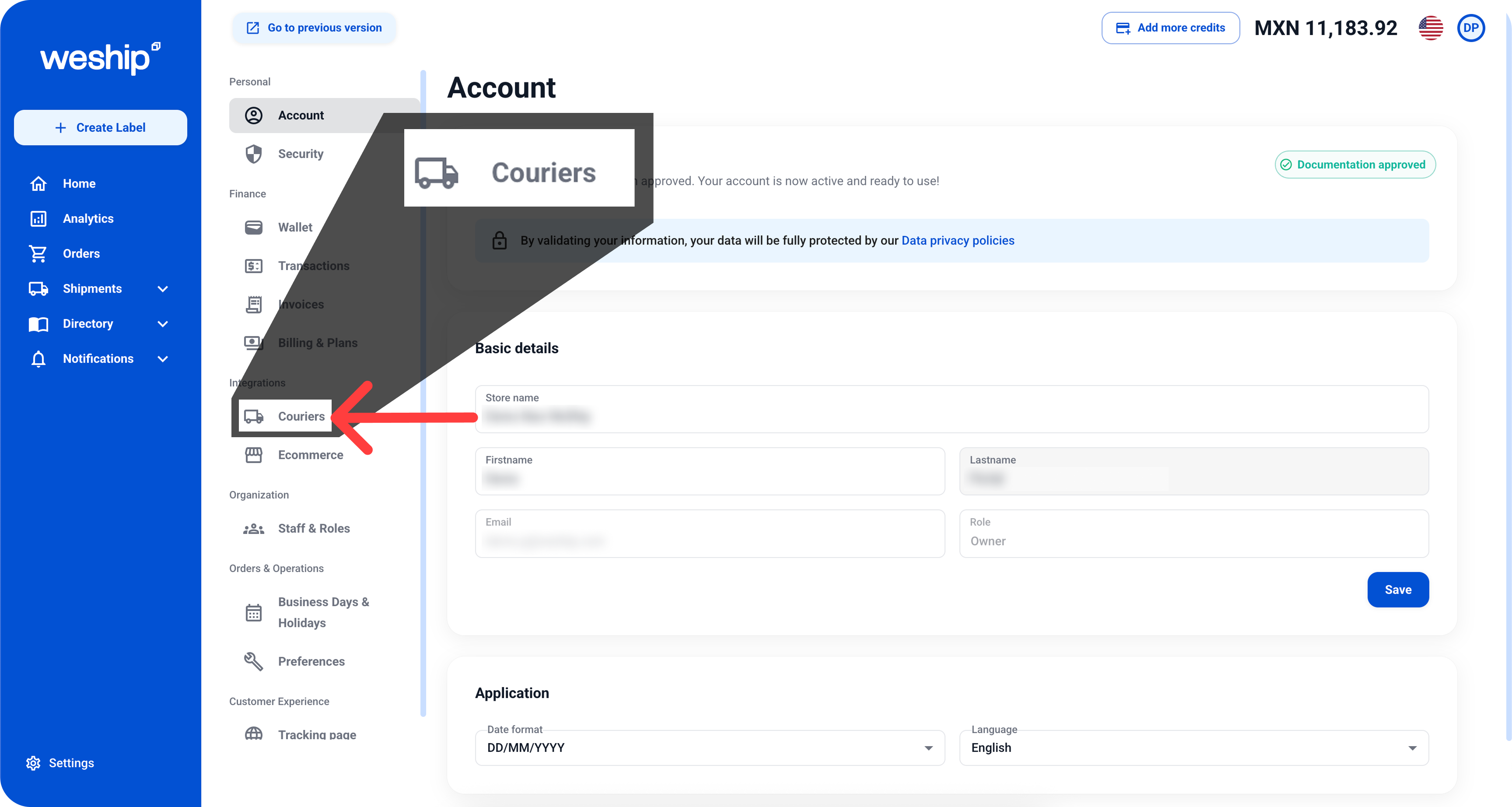 3. Here you will see the carriers you use to quote and ship through WeShip. To add a new carrier, simply click the “Add Couriers” button.