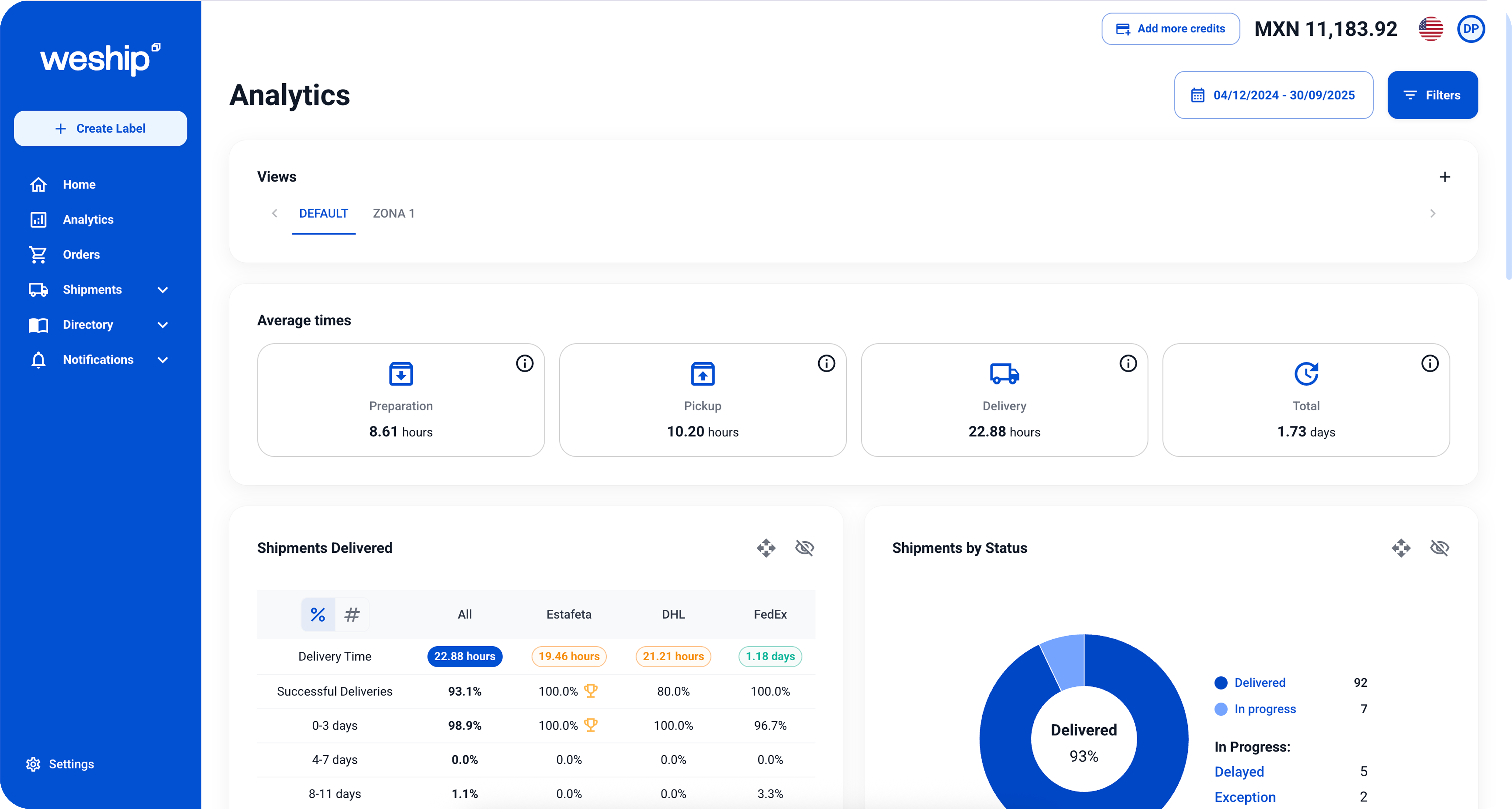 Go to your WeShip dashboard and select the Analytics tab to view metrics for all your shipments.