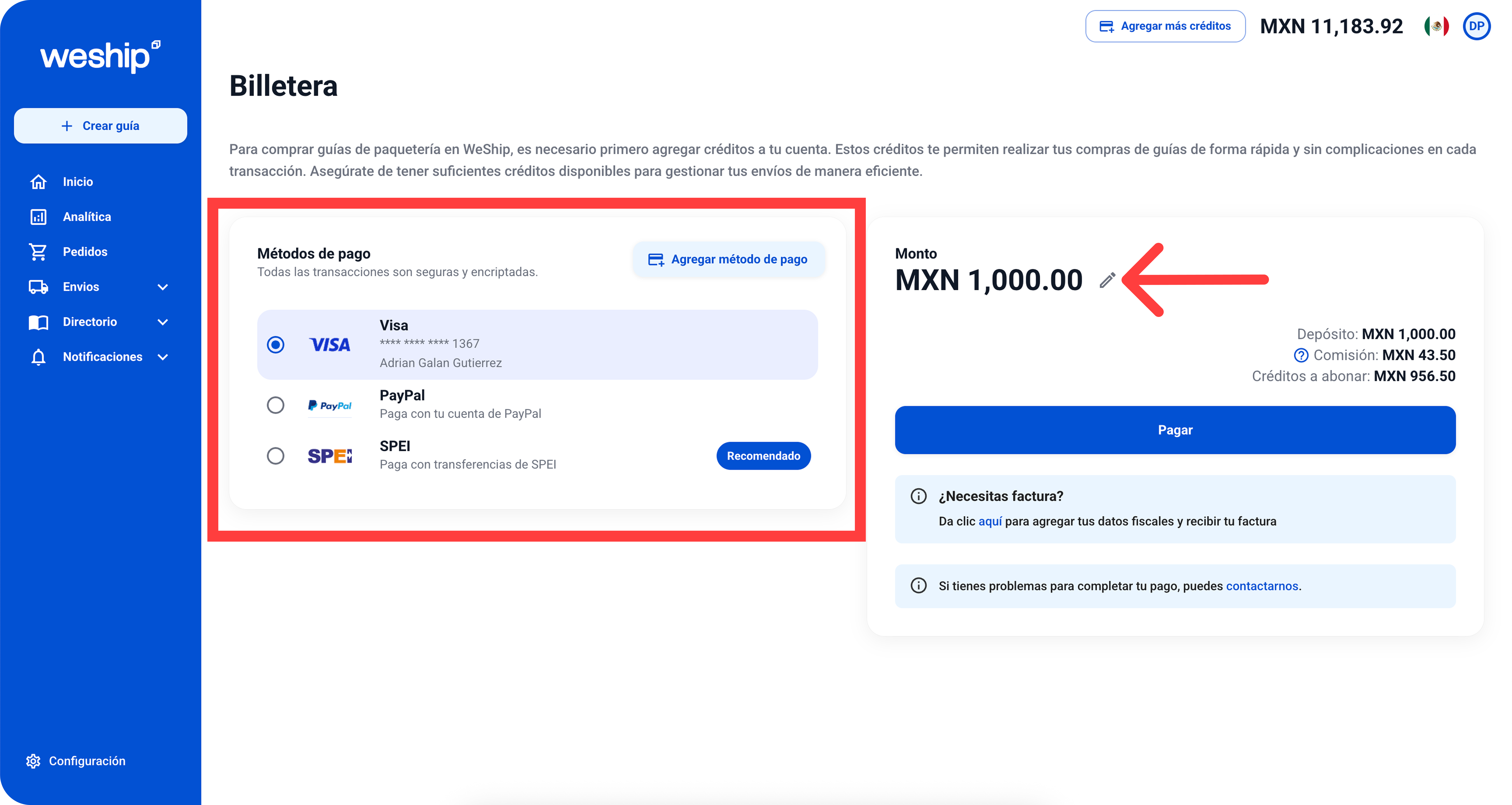 Ya que aparezca el monto a recargar que seleccionaste previamente, da clic en el botón “Pagar” y listo. Una vez completada la transacción, tu monedero mostrará el nuevo saldo disponible para usar en envíos.